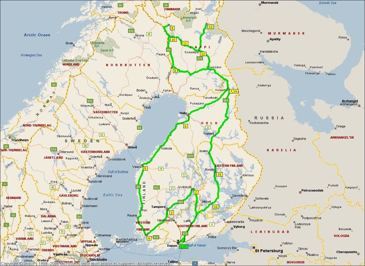 We stayed at Saariselkä for two nights and started driving back to Espoo on Sunday at 08:00 following almost direct route. Our full route looks like this: