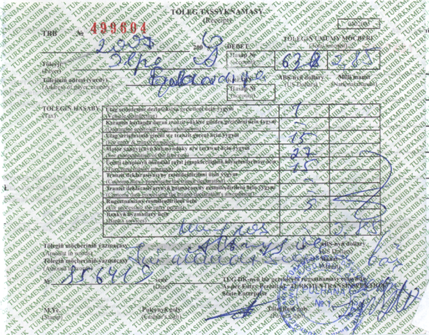 Again, once I entered Turkmenistan border, I was assigned one officer to walk all the doors with me. I counted 12 doors where they all wrote down same information and gave me receipts like this: