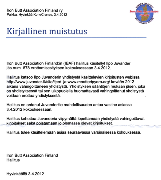 Eli kun menet antamaan palautetta, kommentoimaan toimintaa niin lopputulos on, että sinut erotetaan IBA Finland yhdistyksestä.